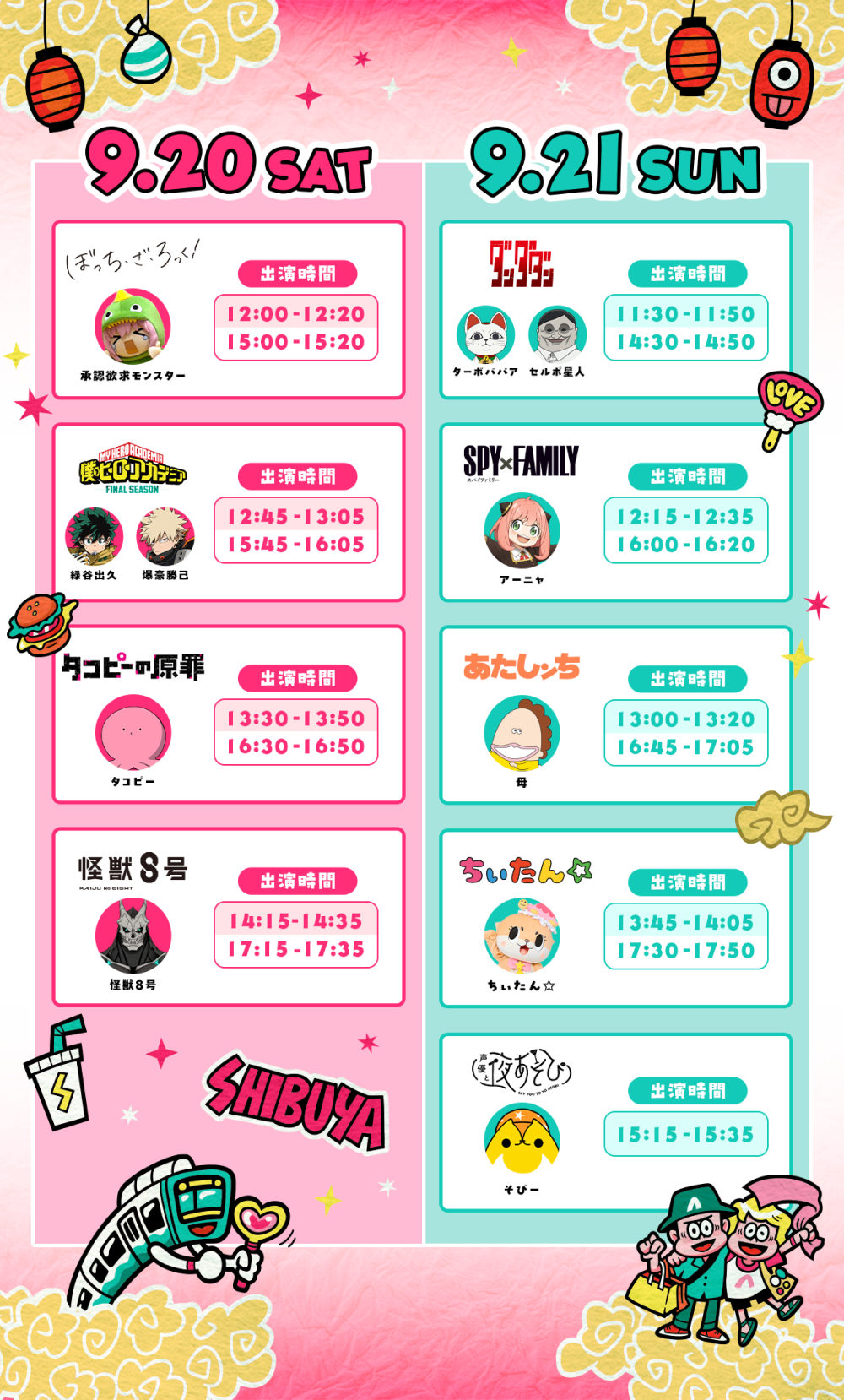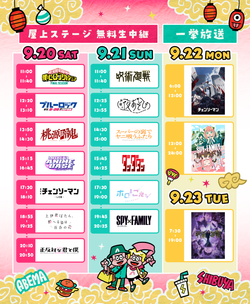 ©けらえいこ/シンエイ ©防衛隊第3部隊 ©松本直也/集英社 ©塀(秋田書店)/上伊那ぼたん製作委員会 © 2025 MAPPA/チェンソーマンプロジェクト ©藤本タツキ/集英社 ©芥見下々/集英社・呪術廻戦製作委員会 ©地主/SQUARE ENIX・「ヤニすう」製作委員会 ©阿賀沢紅茶/集英社・「正反対な君と僕」製作委員会 ©タイザン5/集英社・「タコピーの原罪」製作委員会 ©龍幸伸/集英社・ダンダダン製作委員会 ©遠藤達哉/集英社・SPY×FAMILY製作委員会 ©漆原侑来(秋田書店)/桃源暗鬼製作委員会 ©金城宗幸・ノ村優介・講談社/「ブルーロック」製作委員会 © 堀越耕平/集英社・僕のヒーローアカデミア製作委員会 ©はまじあき/芳文社・アニプレックス ©妖精ちぃたん☆ ©AbemaTV, Inc.